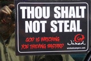 right: Because the crime rate is low, this sign on a camper truck is funny. The fleet of this rental company has outrageous signs on their cars anyway.
