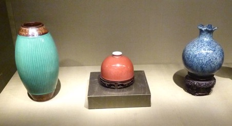 right: l to r.: Fish-roe green olive-shaped zun, Qing Dynasty, Kangxi period (1663-1721); Kidney-bean red Tai Bai zun, Qing Dynasty, Kangxi period (1663-1721); Snowflake blue pomegranate shaped zun with wavy spreading mouth. Qing Dynasty, Yongzhang period (1723-1736)