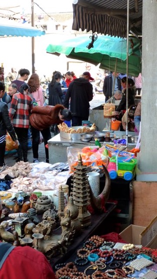 left: A store selling bric-a-brac, where Liam loaded up on some jade bowls. Adjacent to this store is a little food stall with a little pet bird in a cage.