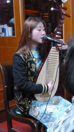 left: This attractive young lady was the tour commentator, singer, pipa player, entertainer, saleslady of tourists items they had on board, etc. She was talking, singing, joking, or playing the pipa almost continuously for a full 60 minutes. Am I glad, I am not married to her.