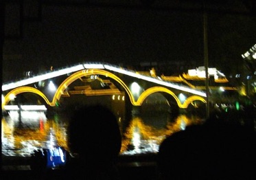 These cruises start from the Ancient Canal Port on Panxu Road at dusk. Passengers are squeezed into motorized, covered barges holding about 100 passengers. Each cruise lasts about 80 minutes. There is a surprisingly large interest in these cruises, as buses come in continuously to unload huge groups of homegrown tourists. The earlier cruises, just after dusk, always seem to sell out. The fare is not inexpensive, but they do give discounts to senior citizens. And looking at the lighted landscape from inside a warm boat is also quite pleasing. The cruise goes all the way to Shantang Street before coming back.