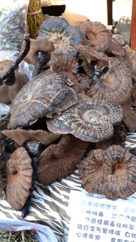 right: Old gnarled Chinese mushrooms in one of the stalls selling produce. I am sure they are medicinal, just from their fierce looks.
