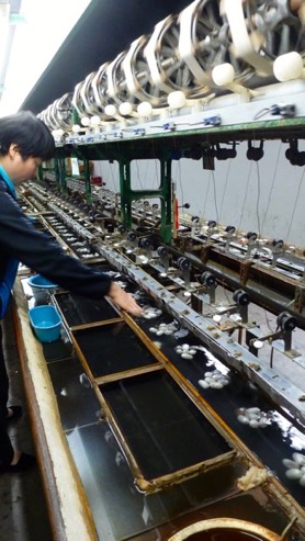 The silkworm creates its cocoon out of a single silk thread that is continuous for approximately 3,600 feet. The process to make skeins from the cocoons is especially important. The workers operate machines that spin the silk filaments into skeins. One cocoon is attached to each spindle. This is why the filament of each cocoon must be unbroken.