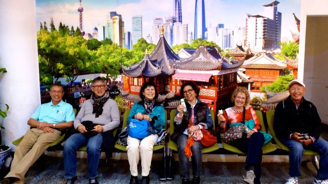 From l to r. Hok, Liam, Norma, Gerdy, Robyn and Andrew in front of a fake view of Shanghai. Liam and Gerdy are from the Netherlands, Robyn and Andrew are from Australia. Wow, do these people look relaxed.