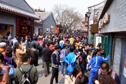As incomes rise, its population travel and go out more. The picture below is of Nan Luo Gu Xiang Street, a popular shopping street in Beijing, about 1 km long, lined with tourist shops, snacks stalls, cafes, restaurants, handicrafts, etc. etc. Almost everybody on this very crowded street is young, vibrant, and Chinese and the shops do a roaring trade. This is typical of China and indicative of the mood of the country. But this is what we encounter almost everywhere; lots of other Chinese people, all on the go.
