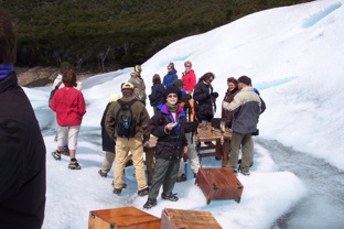 A table with chocolates and a bottle of Famous Grouse whisky. In the middle of nowhere; on the ice. Cheers, everybody got to nibble on chocolates and drink whisky diluted with 400-year old glacier ice. We told you this was a most civilized country.