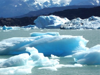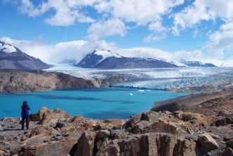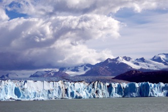 The prevailing winds in that part of the world are from the West, because of the rotation of the earth. These winds, saturated with water after skimming the Pacific Ocean are suddenly forced upwards many thousands of feet as they hit the Cordillera range of the Andes. The air cools down rapidly and the moisture becomes ice and snow which then fall on the Andes at the head of the glacier. Snowfall can be as much as 400” or more per year in that area. On the other side of the Andes, rainfall is as little as 12”/year. The snow and ice falling high in the Andes builds up on the head of the glacier and pushes the glacier forward and down. It takes a snow particle 300-500 years to move from the point of impact to the foot of the glacier where it will then melt in the lake. So, depending on how much snow comes down and how fast the ice melts at the foot, the glacier foot will move forward or recede.