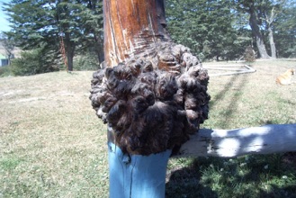The most prevalent tree is the Lenga, or southern beech. Many of these trees have large whorls on their trunks. The tree is attacked by a fungus, and the tree exudes a sap to kill the fungus. The sap coagulates forming a small whorl. The next year fungus attacks the tree at exactly the same spot. More sap is produced and the whorl grows.
