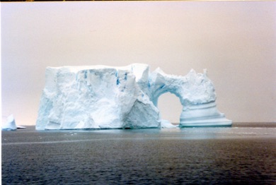 right: A huge iceberg with a beautifully formed portal on the side. Remember that 90 % of the iceberg is under water.