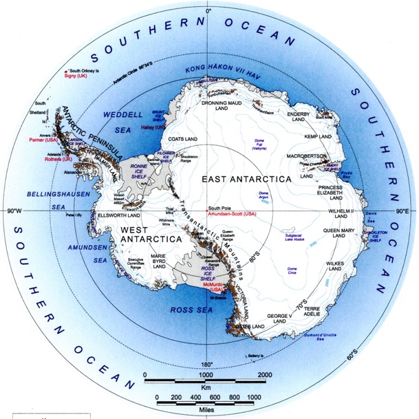 Above: Map of the Antarctic Continent issued by the US Geological Survey. The Antarctic Peninsula is just a small appendix to the large continent. The area where the commercial Antarctica tours go is just that minuscule region to the left of the letters ANT of the Antarctica Peninsula.