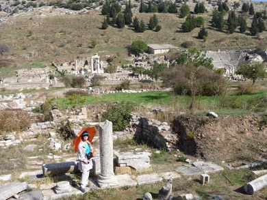 Taxis generally take you to the upper entrance of the archeological site, which is about a 25 minute drive from the cruise terminal over good paved highway roads. Entrance to the site costs 20 turkish liras, which you can pay with a credit card. At US$0.53 per NTL (New Turkish Lira) this would correspond to US$ 10.60. When we were in Turkey in 2002, the exchange rate was 1,360,000 liras for one US$. The Turkish economy has improved rapidly in the last decade. But Larry had the foresight to have some Turkish liras with him. A guide offered us his services for €40, but we declined.