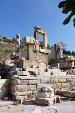With the hundreds of other tourists, we walked down Curetes Street, the main street once lined with shops and inns and in many sections covered with mosaics. The crowd took us to the most photographed site, the Library of Celsus, originally built in 125 AD, in memory of Mr. Celsus, obviously. The facade has been meticulously reconstructed. Tiberius Julius Celsus Polemaenus served as Governor of Roman Asia in the Roman Empire. When he died, the 90,000 talents he left behind was used to design this library and which is also his tomb. At one time it had as many as 25,000 volumes.