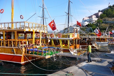 right: Sightseeing pleasure boats with gaily waving Turkish flags in the harbor of Kusadasi, about 2 miles from the cruise ship terminal.