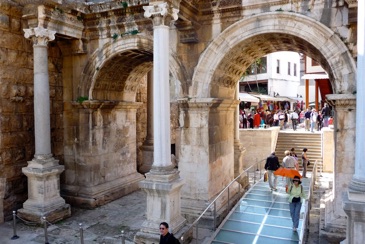 We walked by Hadrian’s Gate, a triumphal gate with three arches, built in honor of the Roman emperor Hadrian on the occasion of his visit to this town in AD 130. The columns are Corinthian in style, with two or three rows of acanthus leaves on its lower and middle sections.