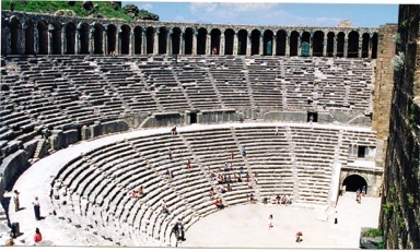 Close to Perge is the ancient city of Aspendos. The most striking relic is the huge and beautiful theater, commissioned by the emperor Marcus Aurelius (161-181 AD), The theater of Aspendos has almost perfect acoustics and was, until recently, used regularly for international concerts and festivals. Modern theater equipment caused damage during one of the performances. So no more performances there, said the Minister of Culture. With a diameter of 315 feet, it can seat 7,000.