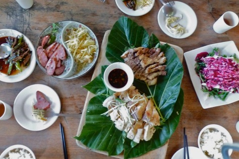 In the picture below you see from left to right: (a) an asparagus-chicken in soy sauce; (b) slices of a nondescript sausage, maybe Kolb and bean sprouts. (c) On the large leaf-lined plate is the entree: sliced roast pork above and steamed chicken below. (d) To the right a dish of thinly sliced raw red cabbage. We were also served a large bowl of clear vegetable soup and a 2-3 lbs large steamed sea-bass. It was simple, wholesome food. Lunch for 8 was around US$60.