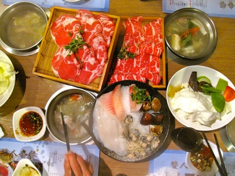 In the picture above, three bowls of independently heated broth are visible. Heating is from a source below the table. On the table are thin slices of beef and lamb as well as a plate of varied seafood. And to the right is a bowl of vegetables.