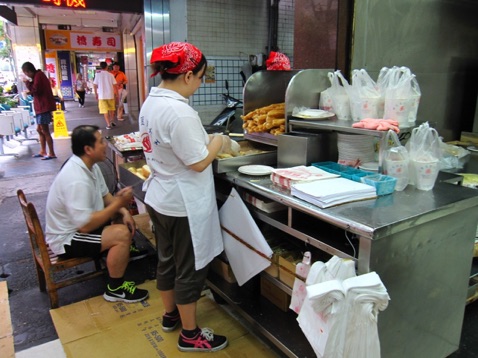 left: This eating place on the side of a covered street specializes in takeout and does not have more than a couple of chairs to the left of the picture. They prepare and sell congee, Chinese thin porridge made from a flavorful base. In the middle is a stack of the Chinese savory “donuts”.