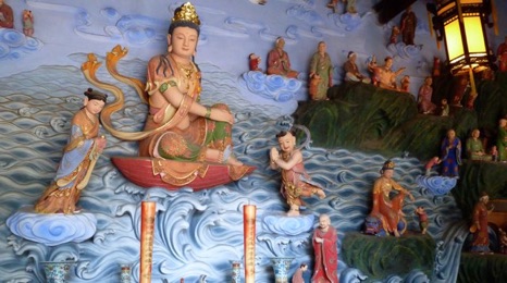 left: The altar in the back of the Yunyan temple shows a smiling Goddess of Mercy and her attendants.