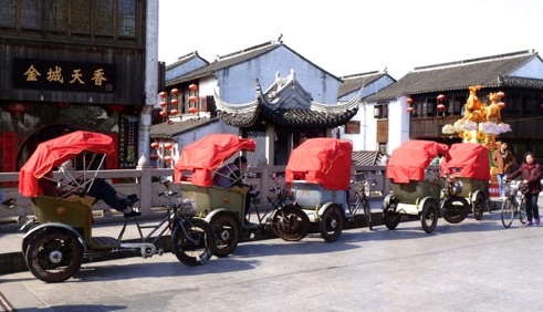 right: With so many rickshaws waiting patiently behind each other, you know you have just entered a tourist area. The entrance to Old Shantang Street is to the left of the furthest rickshaw.