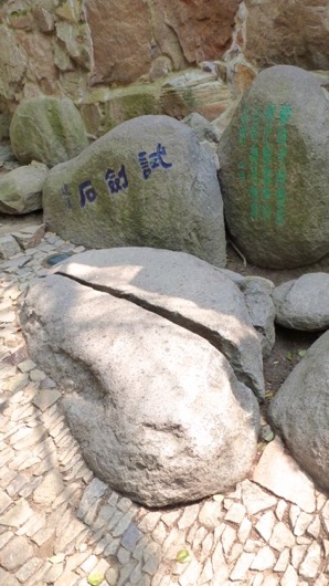 right: King He Lu was a zealous collector of rare swords and it is said that he tested them upon this stone. The crevice thus made in the rock is the only evidence of the existence of these swords, as it is believed that they were buried beneath the Sword Pool as funerary objects.