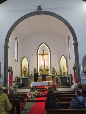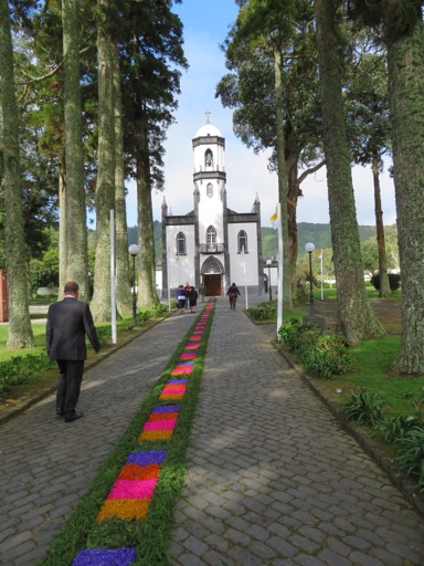 Our first stop in Sete Cidades was the small church of São Nicolau. Located in a very peaceful location, we walked through a path lined with beautiful cryptomeria trees, which came from Japan, headed by two large araucarias. It was Easter Sunday today, and the path to the church had been adorned with colorful chips.