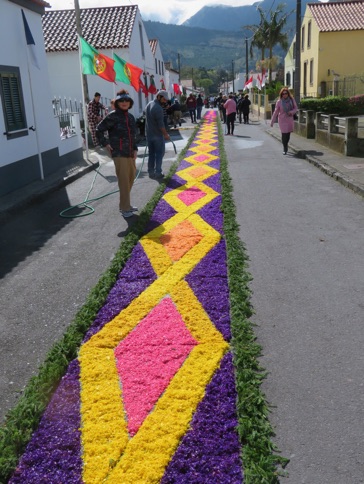 We then walked to the village, where the inhabitants were busily adorning their main street with colored leaves and stuff to celebrate Easter.
