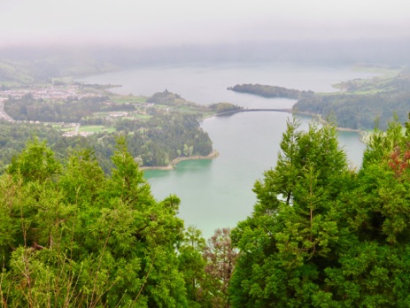 We drove through Ginetes, Varzia, and finally arrived at our destination; Sete Cidades, the largest town on the shores of the Lagoa Azul, the Blue Lake. This Lake is connected to the Lagoa Verde, the Green Lake, and together these two crater lakes are the top tourist attraction of the island. The weather was unfortunately not very cooperative that day; it was overcast and misty. On good day we would have been able to see these two lakes clearly with the different colors next to each other.
