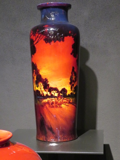 Royal Doulton launched their new flambé creations at the St Louis World Exhibition in 1904, to great acclaim. By 1920, they had developed feathered, veined , and mottled effects in blues, purples and yellows. Images of exotic animals can then be painted under the flambé glazes.