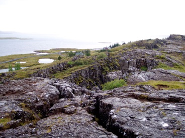 Right here is the boundary, running north-south, where the American continent is moving west and the Afrasian continent is moving East. They move away from each other at a rate of 2 cm/year. The results of these movements can be observed as growing cracks in the soil. The biggest crack is now a deep lake, lake Þingvallavatn, the biggest sweet-water lake in Iceland. You can see this lake in the background of the picture. The west bank, on the other side of this lake belongs to the American continent; the east bank, where this picture was taken, is on the Afrasian continent. The movement of the earth creates these huge cracks everywhere in the rocks.