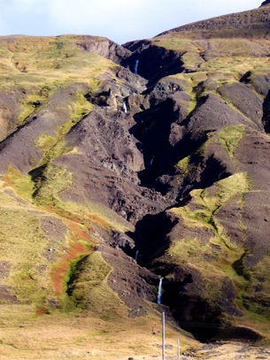 left: Low mountains and a cascade of waterfalls along the road to Akureyri.