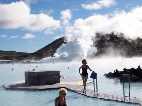The Blue Lagoon is undoubtedly the world’s largest open-air bathtub. First they get high-pressure steam from underground and use this to run steam turbines to generate electricity. The waste steam and hot water from the geothermal power plant is then directed to this huge man-made swimming pool, 2-5 feet deep all over, where the water is a comfortable 90-100˚F all year round. With air temperatures often 40˚F and below, the pond would have cooled down rapidly were it not for the huge amount of hot water and steam being constantly fed into the pool. The water is full of minerals and is colored blue. There is a lot of volcanic rock around. You can see huge amounts of white sulfur particles floating around. It is actually quite pleasant to soak yourself in the warm water, especially on chilly days. What would have been useful is a pair of rubber thongs to walk from the dressing room to the pool and back and not to have to stand on the wet, cold floor, when you get dressed.