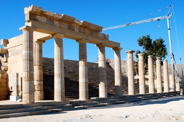 right: Part of the restored acropolis and theater in Lindos