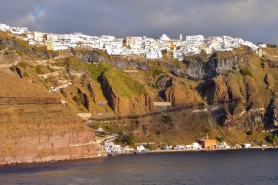left: View of Santorini from the water. The funicular is behind the rock wall on the left