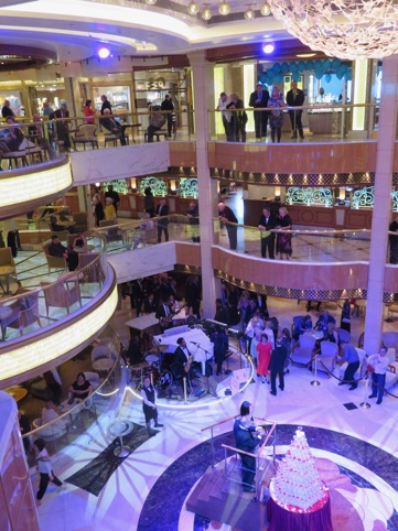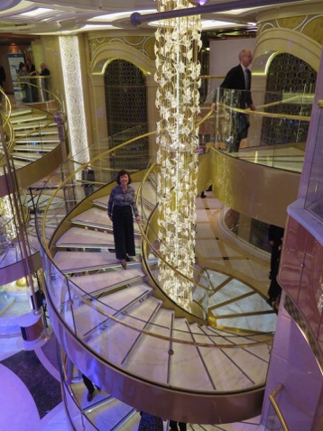 This was the champagne pouring party. Over the stack of champagne glasses of the bottom right of the picture, passengers were invited to pour champagne over the pyramid while their pictures are taken. Making and selling onboard pictures are large income generators for the ship.