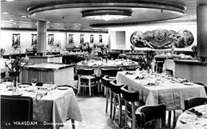 right: The dining room of the m.v. Maadam. This is pretty neat for that time.