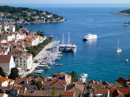 right: The beautiful harbor of Hvar. The second boat on the left of the 4 boats moored next to each other was our ship, the Kapitan Bota II. To the right is another small cruise ship. In the middle of the picture is the Jadrolinia car ferry connecting most of the large islands on the Adriatic coast. To the left of the cruise ships